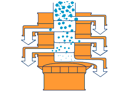 旋轉篩粉機采用YZUL立式振動電機作為激振源,通過振動電機上下兩端的偏心重錘將旋轉運動轉變為水平、垂直、傾斜的三次元運動,并傳遞到篩粉機的篩面上;物料通過入料口進入設備內,根據不同物料篩分要求,物料經過1-5層采用不同目數的金屬編織篩網的篩分層,在這個過程中,位于各層的篩網下的清網裝置(彈跳球)通過頻率振動不斷撞擊篩網,使篩網上層物料能夠順暢的透網篩分,并有效解決了物料堵網問題出現,不同目數的物料通過各層對應目數的篩網后在各層的出料口排出,實現篩選除雜或過濾分級的目的。調節上、下兩端的相位角,可以改變物料在篩面上的運動軌跡。