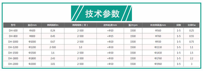 氣體保護超聲波振動篩的型號有多種,有φ400-φ1800mm直徑的7種標準型號,價格的差異根據材質和直徑大小、層數不同,這樣也就直接影響了產量上的變化,一般來說,產量越大振動篩的價格就會越高。具體參數如下圖所示。