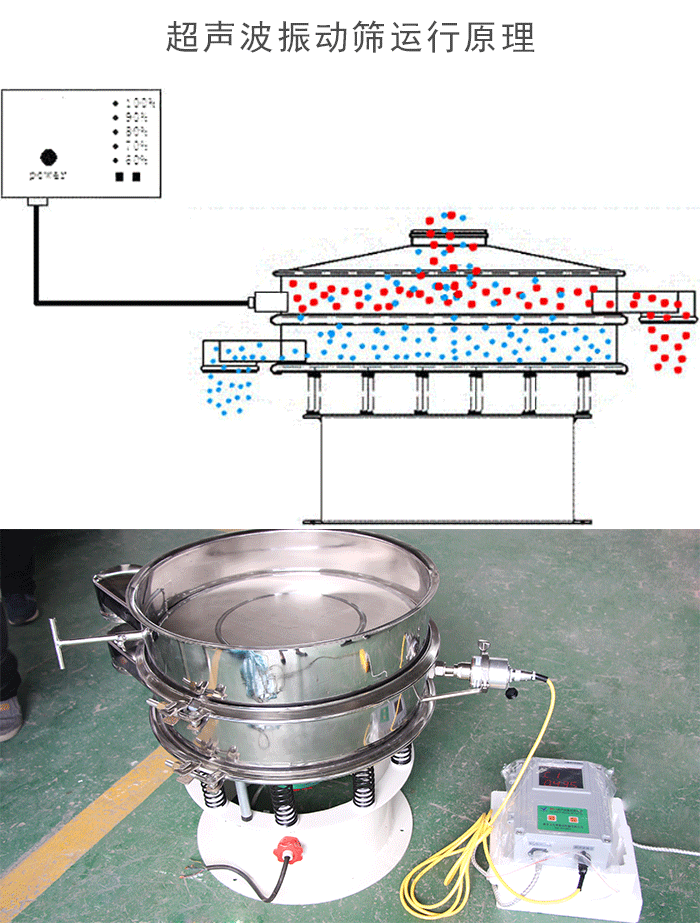 超聲波振動篩是將220v、50HZ或110v、60HZ電能轉化為38KHZ的高頻電能,輸入超聲換能器,將其變成38KHZ機械振動,從而達到高效篩分和清網的目的。超微細粉體接受巨大的超聲加速度,使篩面上的物料始終保持懸浮狀態,從而抑制粘附、摩擦、平降、等堵網因素。解決了強吸附性、易團聚、高靜電、高精細、高密度、輕比重等篩分難題,使超細微粉篩分不再難事,特別適合高品質、精細粉體的用戶使用 高頻振動篩采用筒體式偏心軸激振器及偏塊調節振幅,物料篩淌線長,篩分規格多,具有結構可靠、激振力強、篩分效率高、振動噪音小、堅固耐用、維修方便、使用安全等特點。由于高頻振動篩采用了高頻率,一方面破壞了礦漿表面的張力和細粒物料在篩面上的高速振蕩,加速了大密度有用礦物和析離作用,增加了小于分離粒度物料與篩孔接觸的概率。