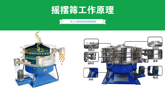搖擺式振動篩是一種仿人工搖動的低頻旋振篩,其原理是:瞬時運動為沿徑向的位移和以此位移為軸的圓周運動的合成(螺旋運動)。即可調節偏心距的激振器產生了非線性三維運動,物料也產生同樣的近似手動作業的運動,從而達到篩分之目的,再配合篩分附件可得到更加理想的篩分效果;適合于圓球狀、圓柱狀、片狀、乃至不規則形狀易堵網且需要精密篩分的物料。