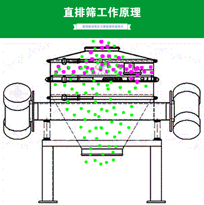 由直立式電機作激振源,電機上、下兩端安裝有偏心重錘.將電機的旋轉運動轉變為水平、垂直、傾斜的三次元運動,再把這個運動傳遞給篩面。調節上、下兩端的相位角.可以改變物料在篩面上的運動軌跡。適合食品、制藥、化工、冶金等行業。