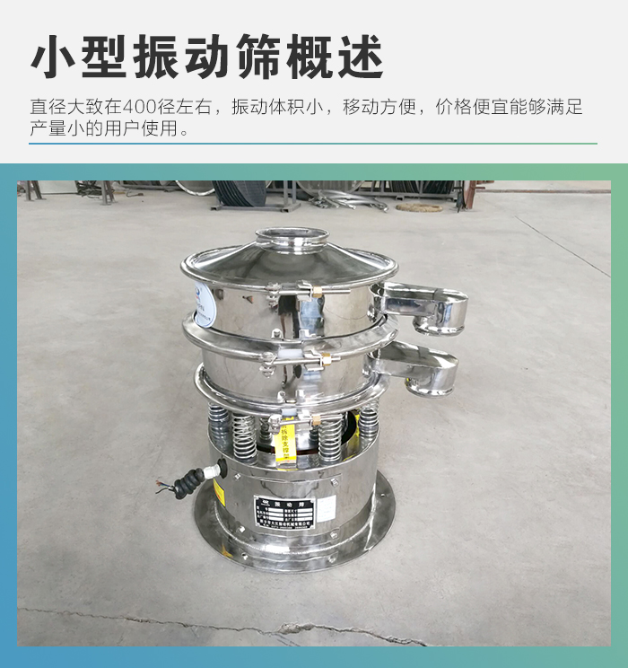 小型振動篩為400mm直徑一層兩個出口不銹鋼振動篩,整機采用304不銹鋼材質(zhì),廣泛應(yīng)用于食品,醫(yī)藥,顆粒型物料的篩分行業(yè)。