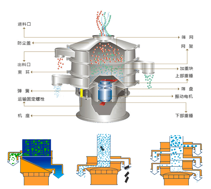 小型不銹鋼振動篩是由直立式振動電機作為激振源,電機上、下兩端安裝有偏心重錘,將電機的旋轉(zhuǎn)運動轉(zhuǎn)變?yōu)樗健⒋怪薄A斜的三次元運動,再把這個運動傳遞給篩面進(jìn)行篩分。調(diào)節(jié)上、下兩端的相位角,可以改變物料在篩面上的運動軌跡。
